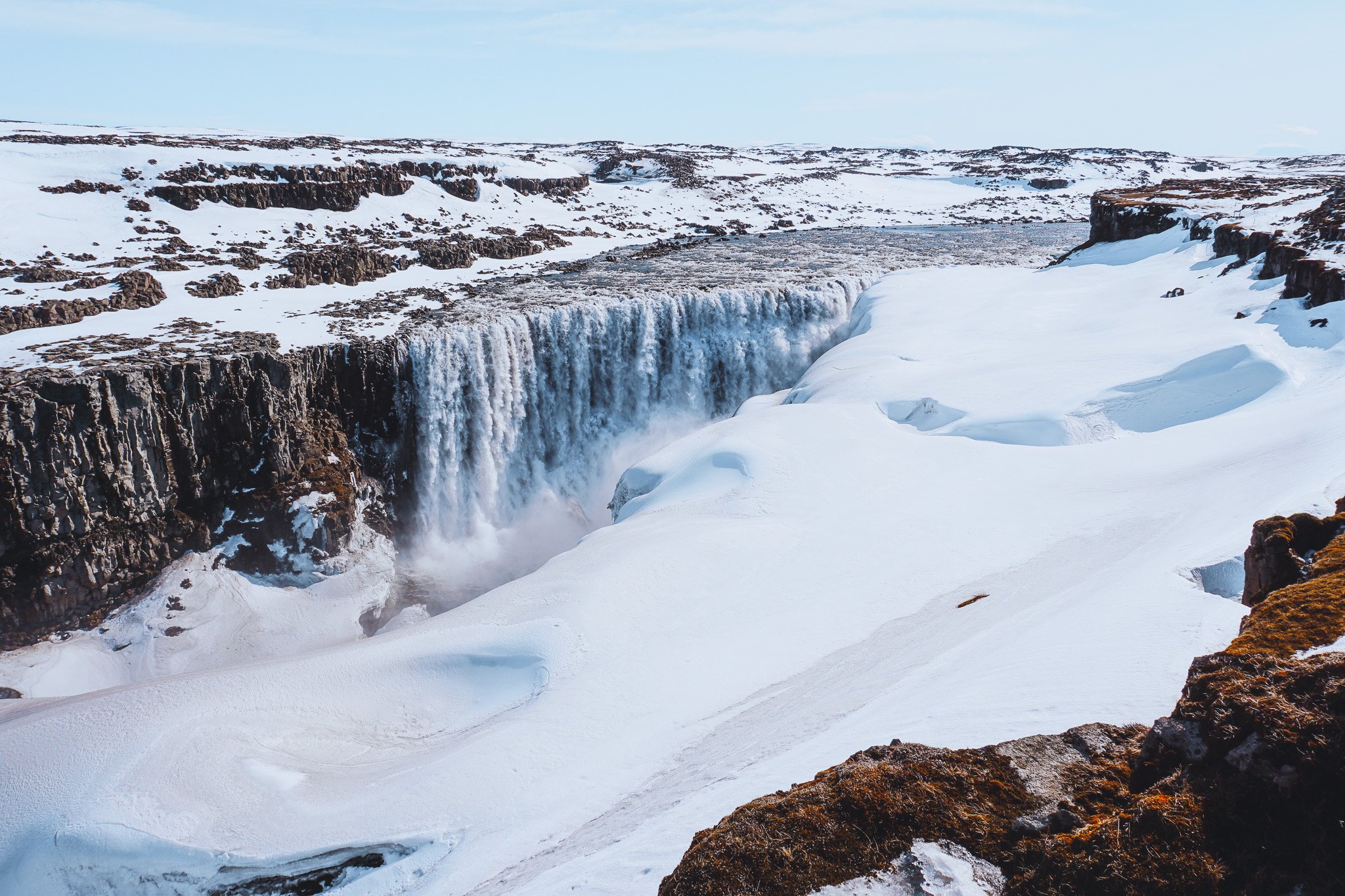 Dettifoss, the second most powerful waterfall in Europe after the Rhine Falls, is not far along the same road. The hike to the falls had only recently opened for the season, so we had to struggle through knee-high snow at times. Although difficult to photograph, due to the extreme contrast and light, seeing this waterfall surrounded by pure white was an epic experience!